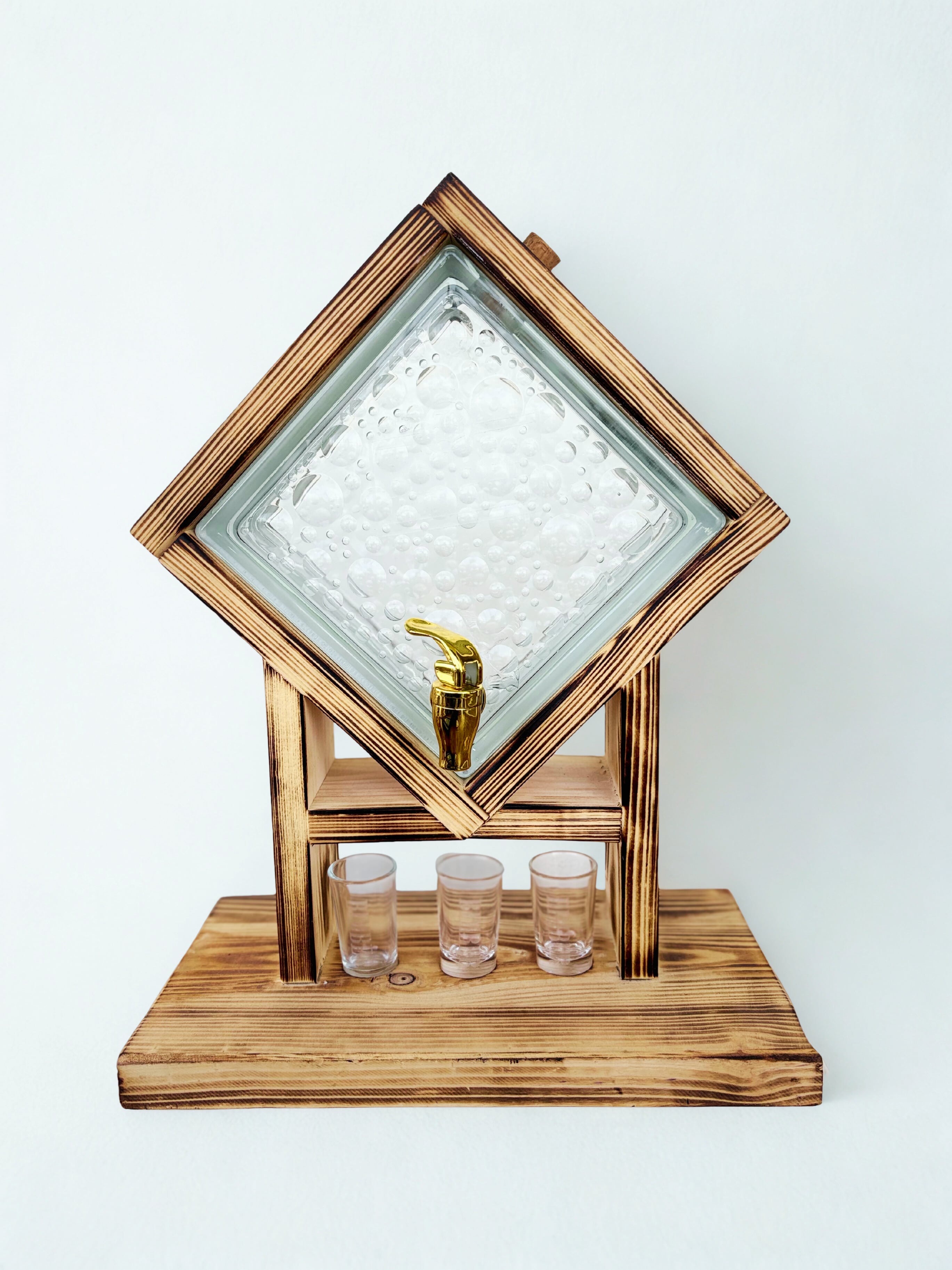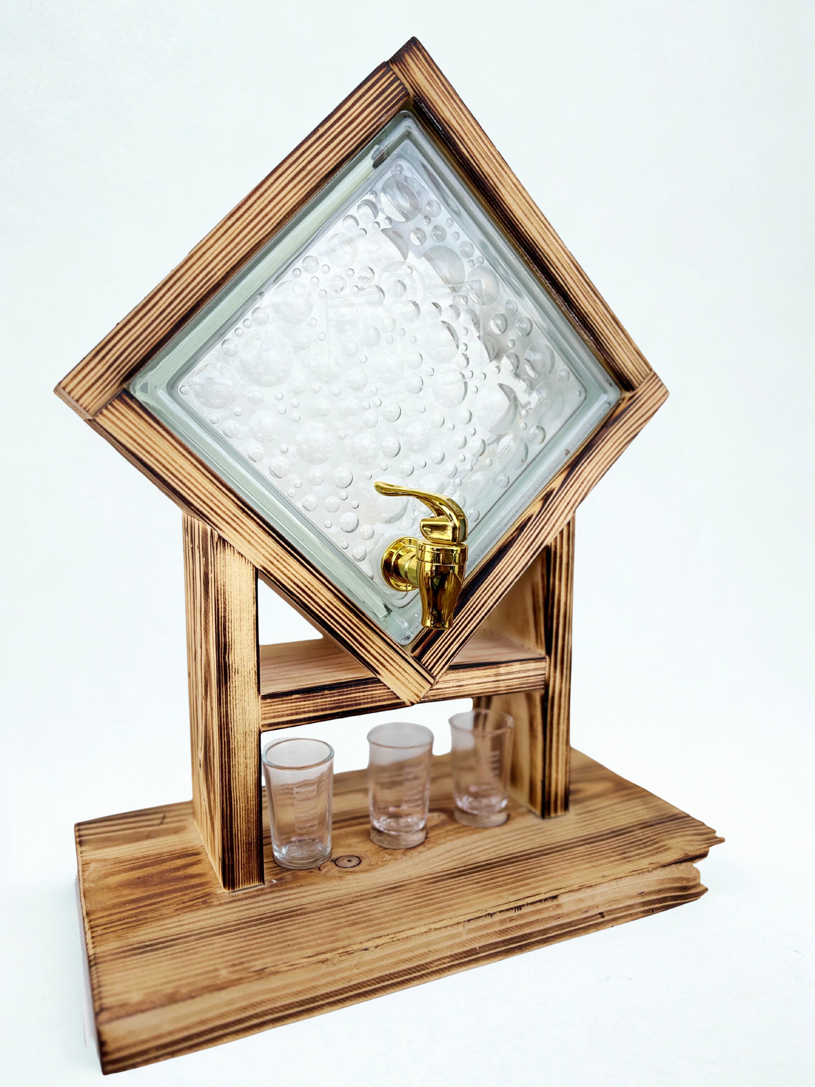 Szklany dozownik do alkoholu pozwala też na kontrolę – widać ile trunku zostało, jaki ma kolor, czy przypadkiem nie pojawił się osad (ważne przy domowych nalewkach). Drewniany stojak stabilizuje całość i dodaje rustykalnego charakteru.